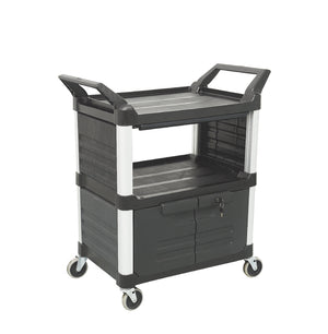 90kg Rated 3 Shelf Commercial Trolley Hospitality Cart with Lockable Doors, Sliding drawer - Black