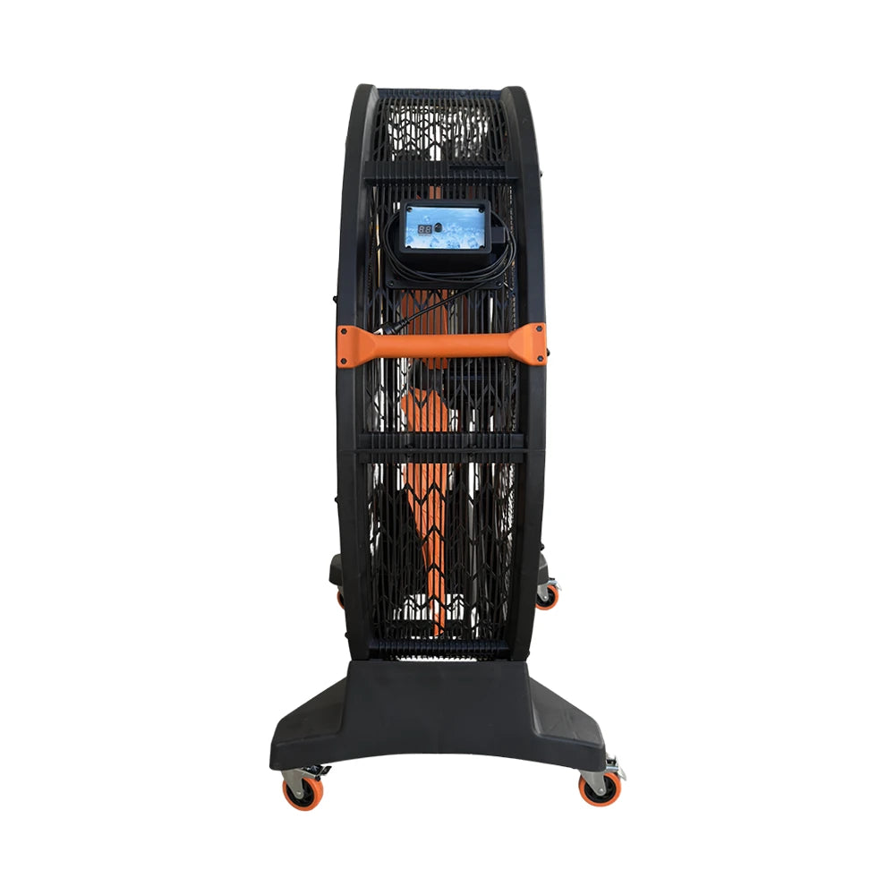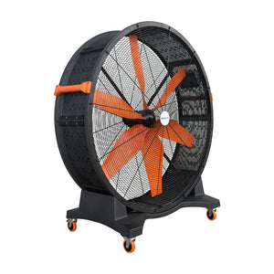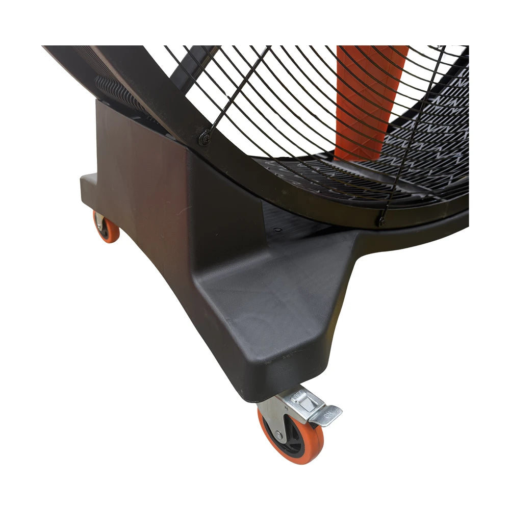 - Portable industrial fan on castors with brakes for easy movement and positioning across large spaces, perfect for use in warehouses, factories, workshops, and other industrial environments.