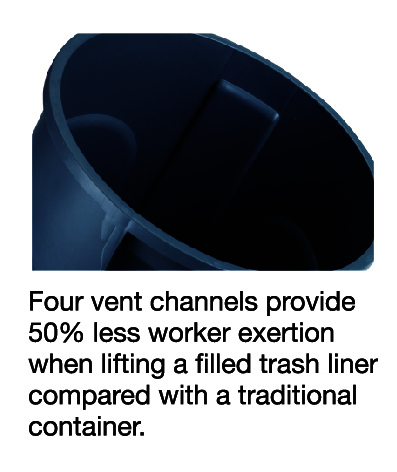 - Four vent channels reduce lifting effort by 50%, making it easier to handle a filled trash liner, ideal for busy environments with high foot traffic.